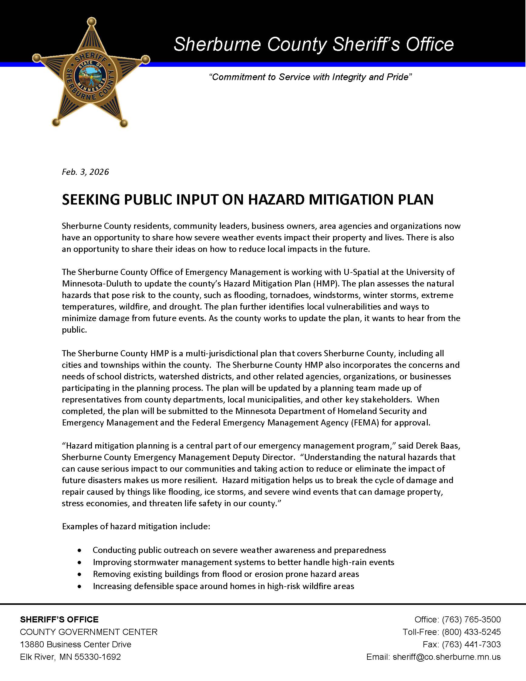 Sherburne County Emergency Management is commencing work on the update of the Sherburne County Hazard Mitigation Plan (HMP). They are asking Sherburne County residents, community leaders, business owners, area agencies and organizations to share how severe weather events impacts your property and lives and to share ideas on how to reduce local impacts in the future.